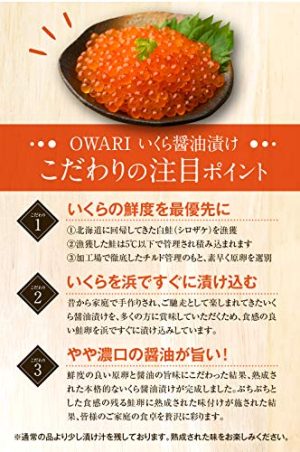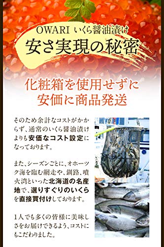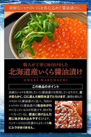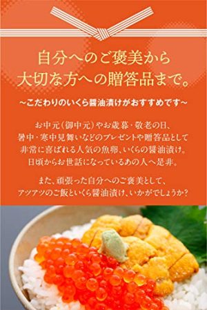 詳細: 「 いくら醤油漬け」は北海道に遡上してくる上質の秋鮭の卵を使用し、プロの職人が丁寧に味付けを行っているため味・食感ともにお客様に非常に喜ばれております。 鮮度の高いいくらは明るいオレンジ色をしており、粒がしっかりと丸い形を保っていて、噛むと弾力を感じることができます。 「 いくら醤油漬け」は、オホーツク海を臨む網走や、釧路、噴火湾といった北海道の名産地で選りすぐりのいくらを新鮮な状態で冷凍しています。 だから解凍しても粒に弾力があり、噛んだときのプチプチ感を存分に楽しんでいただけるのです。 新鮮ないくらがもつ独特の甘みと厳選した漬け込み醤油の程よいしょっぱさが絡み合って、お口いっぱいに広がります。いくら本来の味わいがこの一品に詰まっている、当社自慢の商品です。