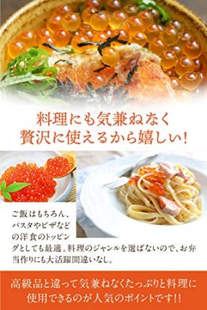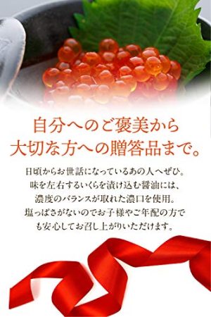 - 【両親や知人に喜んでもらいたい】味を左右する、いくらの醤油は「濃度のバランスが取れた濃い口」を使用しています。しょっぱさがないのでお子様からご年配の方まで安心してお召し上がりいただけます。お世話になっている知人や友人、両親などのプレゼント用にいかがですか。