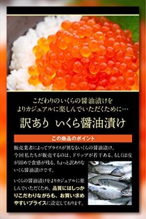 - 【リーズナブルなのに美味しいから、家族みんなが笑顔になる】北海道産の訳ありサケいくら醤油漬けです。訳ありの理由は、粒の大きさにバラつきがある、もしくは皮が固めで食感が少し残る、ドリップ(赤い水分)が若干ある、化粧箱なしだからですが、元は贈答用としても販売されている高級ないくら醤油漬けで、醤油といくらの品質にはこだわっております。美味しいのに家計にも優しいので、家族みんなが笑顔になれます。