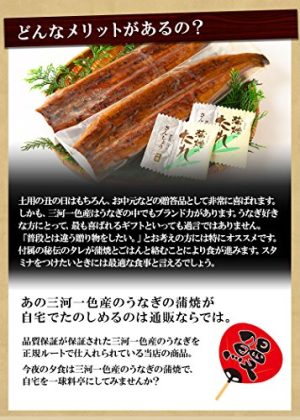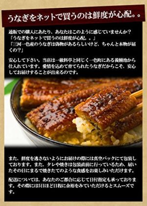 詳細: いつも近所のスーパーでうなぎを購入しているあなたにとって、当店の商品はかば焼きのイメージを大きく変えることになるかもしれません。 「一度食べたら、もうほかには戻れない」そんなグルメ好きをうならせた三河一色産のうなぎのかば焼きをご紹介します。 【この商品のポイント】 三河一色は、愛知県にある駅名。現在では廃線となっています。この駅がある一色町は、水産業が盛んな街で、年間6000トンもの鰻を生産。なんと生産量は日本の1/4! 数々の一級料亭で仕入れられており、それゆえ三河一色産のうなぎは、グルメな芸人や著名人からも愛されています。 安物の海外産に比べ、蒲焼にした際にタレが均一に染み込みやすくなっており、ふっくらと仕上がります。 そのため、表面はカリッとしつつ、身はふっくらとした食感が楽しめるのが特徴。 【自宅で三河一色産のうなぎの蒲焼を楽しむコツ】 「前に通販サイトでうなぎの蒲焼セットを購入したけど、あまり上手に焼けなくて美味しくなかった。。」 美味しく焼くポイントは、湯煎をしてゆっくり回答してから、グリルを中火にしてじっくり焼くこと。 これだけで、自宅にいながら料亭と同じ三河一色産のうなぎの蒲焼を楽しめます! しかも秘伝のタレが付属していますので、面倒な調理は一切不要。家事で忙しい主婦や主夫の強い味方です。 【どんなメリットがあるの?】 土用の丑の日はもちろん、お中元などの贈答品として非常に喜ばれます。 しかも、三河一色産はうなぎの中でもブランド力があります。うなぎ好きな方にとって、最も喜ばれるギフトといっても過言ではありません。 「普段とは違う贈り物をしたい。」とお考えの方には特にオススメです。 付属の秘伝のタレが蒲焼とごはんと絡むことにより食が進みます。スタミナをつけたいときには最適な食事と言えるでしょう。 【あの三河一色産のうなぎの蒲焼が自宅でたのしめるのは通販ならでは。】 品質保証が保証された三河一色産のうなぎを正規ルートで仕入れられている当店の商品。 今夜の夕食は三河一色産のうなぎの蒲焼で、自宅を一級料亭にしてみませんか? 通販での購入にあたり、あなたはこのように感じていませんか? 「うなぎをネットで買うのは鮮度が心配。。」 「三河一色産のうなぎは偽物があるらしいけど、ちゃんと本物が届くの?」 安心して下さい。当店は一級料亭と同じく一色町にある養鰻池から仕入れています。愛情を込めて育てられたうなぎだからこそ、安心してお届けすることが出来るのです。 また、鮮度を逃さないようにお届けの際には真空パックにて包装しております。また、タレや焼きは包装直前に行っているため、届いたその日にまるで焼きたてのような食感をお楽しみいただけます。 配送については、あなたのご都合に応じて日付指定も承っております。その際には5日ほど日程に余裕をみていただけるとスムーズです。