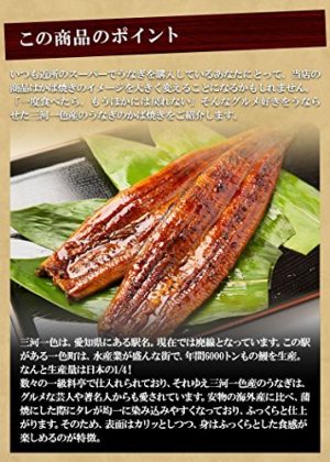 詳細: いつも近所のスーパーでうなぎを購入しているあなたにとって、当店の商品はかば焼きのイメージを大きく変えることになるかもしれません。 「一度食べたら、もうほかには戻れない」そんなグルメ好きをうならせた三河一色産のうなぎのかば焼きをご紹介します。 【この商品のポイント】 三河一色は、愛知県にある駅名。現在では廃線となっています。この駅がある一色町は、水産業が盛んな街で、年間6000トンもの鰻を生産。なんと生産量は日本の1/4! 数々の一級料亭で仕入れられており、それゆえ三河一色産のうなぎは、グルメな芸人や著名人からも愛されています。 安物の海外産に比べ、蒲焼にした際にタレが均一に染み込みやすくなっており、ふっくらと仕上がります。 そのため、表面はカリッとしつつ、身はふっくらとした食感が楽しめるのが特徴。 【自宅で三河一色産のうなぎの蒲焼を楽しむコツ】 「前に通販サイトでうなぎの蒲焼セットを購入したけど、あまり上手に焼けなくて美味しくなかった。。」 美味しく焼くポイントは、湯煎をしてゆっくり回答してから、グリルを中火にしてじっくり焼くこと。 これだけで、自宅にいながら料亭と同じ三河一色産のうなぎの蒲焼を楽しめます! しかも秘伝のタレが付属していますので、面倒な調理は一切不要。家事で忙しい主婦や主夫の強い味方です。 【どんなメリットがあるの?】 土用の丑の日はもちろん、お中元などの贈答品として非常に喜ばれます。 しかも、三河一色産はうなぎの中でもブランド力があります。うなぎ好きな方にとって、最も喜ばれるギフトといっても過言ではありません。 「普段とは違う贈り物をしたい。」とお考えの方には特にオススメです。 付属の秘伝のタレが蒲焼とごはんと絡むことにより食が進みます。スタミナをつけたいときには最適な食事と言えるでしょう。 【あの三河一色産のうなぎの蒲焼が自宅でたのしめるのは通販ならでは。】 品質保証が保証された三河一色産のうなぎを正規ルートで仕入れられている当店の商品。 今夜の夕食は三河一色産のうなぎの蒲焼で、自宅を一級料亭にしてみませんか? 通販での購入にあたり、あなたはこのように感じていませんか? 「うなぎをネットで買うのは鮮度が心配。。」 「三河一色産のうなぎは偽物があるらしいけど、ちゃんと本物が届くの?」 安心して下さい。当店は一級料亭と同じく一色町にある養鰻池から仕入れています。愛情を込めて育てられたうなぎだからこそ、安心してお届けすることが出来るのです。 また、鮮度を逃さないようにお届けの際には真空パックにて包装しております。また、タレや焼きは包装直前に行っているため、届いたその日にまるで焼きたてのような食感をお楽しみいただけます。 配送については、あなたのご都合に応じて日付指定も承っております。その際には5日ほど日程に余裕をみていただけるとスムーズです。