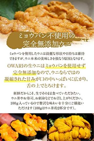 詳細: 贅沢な冷凍ウニをお手頃価格で チリなど、厳選した産地から直送されたの冷凍ウニ。完全無添加の生ウニです。 「おいしいウニをお手頃価格で食べていただきたい」。そんな思いを形にしました。 スーパーやデパートのウニは少しの量でも、購入しようと思うとちょっと躊躇してしまう値段です。の冷凍ウニは、味を重視する方にこそ食べていただきたい一級品の生ウニをお手頃価格でご提供しています。 濃厚な甘みが凝縮された完全無添加の生ウニ ミョウバンを使用したウニはきれいな形状や日持ちは維持できますが、ウニ本来の美味しさを損なう原因となってしまいます。 OWARIの生ウニはミョウバンを使用せず完全無添加なので、ウニならではの凝縮された甘みが口の中いっぱいに広がり、舌の上でとろけます。 新鮮だからこそ、生でそのまま食べていただきたい。ウニ丼やお寿司、お刺身などでお召し上がりください。100g x 3P入っているので贅沢な味わいを十分にご堪能いただけます(100gはウニ丼約2杯分です)。 生ウニのおすすめの食べ方 これだけ贅沢に入っている生ウニですので、海鮮丼やウニ丼としてたっぷり盛り付けてもいいですし、お酒のつまみはもちろん、そのままお刺身としても召し上がっていただくのもおすすめです。 とても上質で美味しい生ウニですので、素材の味をそのまま堪能していただくのをおすすめします。 醤油をかけずに生ウニの塩気を少し感じるぐらいの状態で食べていただくと、美味しさをより実感していただけるはずです。 ご飯や日本酒・焼酎などとの相性も抜群です。 ウニのおいしい解凍方法 生ウニを美味しく召し上がっていただくために、冷凍状態で届いたものを冷蔵庫で時間をかけてゆっくりと解凍してください。 解凍時間の目安は、冷蔵庫内で約5~6時間です。解凍後は早めにお召し上がり下さい。 品質を保持する為にも、一度解凍したものは再度冷凍するのはおすすめしません。