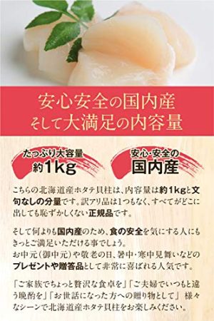 - 【規格・サイズ】ホタテ貝(貝柱)原材料名:ホタテ貝【内容量】3kg (1kg x 3P)【原産地】北海道 【賞味期限】解凍日後1週間(解凍後はなるべくお早めにお召し上がり下さい)※本品は北海道の新鮮なホタテ貝を精選しトンネルフリーザーで急速冷凍したものです。そのまま解凍してご利用頂けます。【お召し上がり方】美味しい食べ方は自然解凍して、お刺身、フライ、グラタン、バター焼き、ホタテご飯、その他お吸い物等、色々な料理にお使い下さい。【使用方法】解凍する時はできるだけ低い温度でゆっくり解凍し半解凍になったら直ちに調理して下さい。一度解凍したものを再び冷凍しますと品質が変わる事がありますので、ご注意下さい。