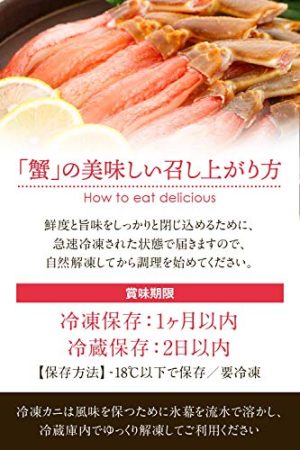 - 冷凍カニは風味を保つために氷幕を流水で溶かし、冷蔵庫内でゆっくり解凍してご利用ください