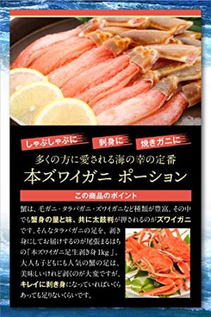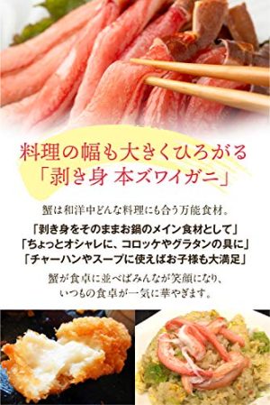 - 商品内容:本ズワイガニ脚生剥き身 総重量1kg (1kg当り30~60本入) ※氷幕の重量を含む 産地:カナダ・アメリカ・ロシア他(国内加工)