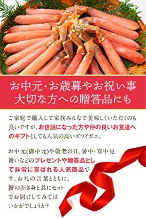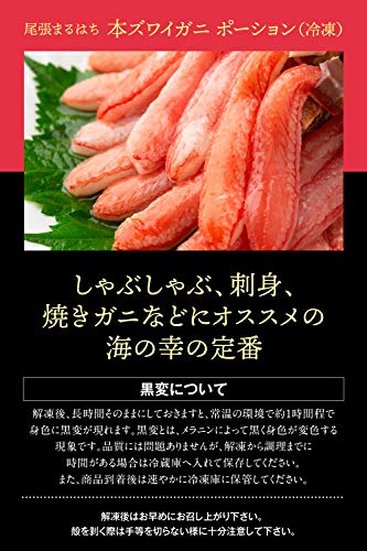 詳細: 多くの方に愛される海の幸「蟹」 海の幸の定番として多くの方に愛される「蟹」。蟹は、毛ガニ・タラバガニ・ズワイガニなど種類が豊富です。その中でも蟹身の量と味、共に太鼓判が押されるのがズワイガニです。そんなズワイガニは国内での流通も多いので、誰もがどこかで1度は味わった事のある蟹でしょう。 ズワイガニの旬は日本海では冬場ですが、北の海域では秋から春にかけて。西の海域では秋から冬にかけて。時期がずれているので美味しいズワイガニを求めて旅行に出かける人もいる程です。 さらに、海外で水揚げされたズワイガニも日本へ輸入されており、ここ数年、食する頻度は確実に増えてきています。 海の幸の中でも特にファンの多いタラバガニの足を、剥き身にしてお届けするのが尾張まるはちの「本ズワイガニ足生剥き身1kg」です。 大人も子どもも関係なく人気の蟹の足は、美味しいけれど剥くのが大変ですが、キレイに剥き身になっていればいくらあっても足りないくらいです。 料理の幅も広がる「剥き身本ズワイガニ」 蟹は和洋中どんな料理にも合うので料理するのも楽しくなります。 ・剥き身をそのままお鍋のメイン食材として ・コロッケやグラタンの具に使えばちょっとオシャレな食卓に ・チャーハンやスープに使えば育ち盛りの子どもも大満足 蟹が食卓に並べばみんなが笑顔になり、いつもの食卓が一気に華やぎます。 鮮度と旨味をしっかりと閉じ込めるために急速冷凍された状態で届きますので、自然解凍してから調理を始めてください。 冷凍では約1ヶ月、冷蔵では2日が保存期間となります。 お中元・お歳暮やお祝い事にも ご家庭で購入して家族みんなで美味しくいただくのも良いですが、お世話になった方や仲の良いお友達へのギフトとしても人気の高いズワイガニ。 お礼の言葉とともに、蟹の剥き身と共にセットでお届けしてみてはいかがでしょうか? 繊細で上品かつジューシーな食感を楽しむことができるズワイガニ。噛めば噛むほど旨味がどんどん増してきて本物の味を堪能できます。 焼いてよし、鍋でもよし、もちろんそのままでもお楽しみいただけます。 ぜひこの触感と旨味をご体験ください。