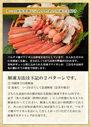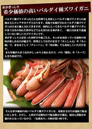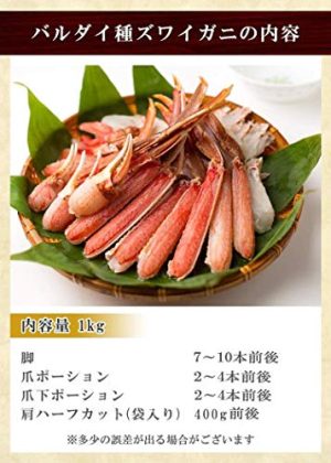 - 内容量:1kg(脚7~10本前後、爪ポーショ2~4本、爪下ポーション2~4本、肩ハーフカット(袋入り)400g前後)※本数が前後する場合があります